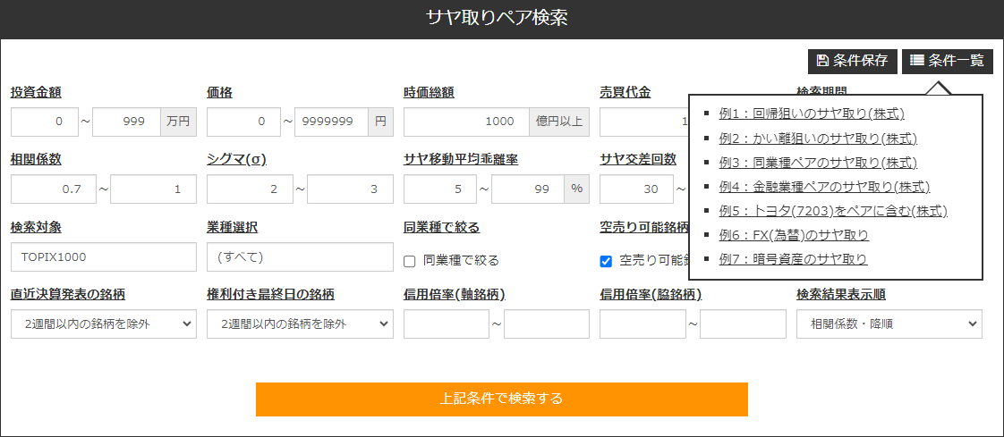 2銘柄の「買い」と「売り」を同時に保有する両建てペアを検索する事が出来るツールです。