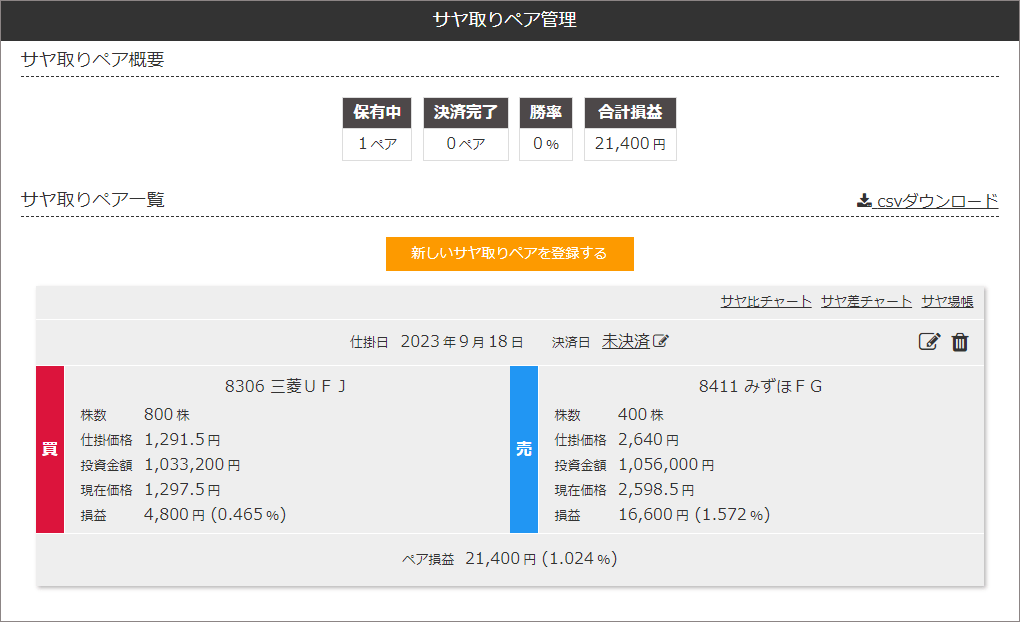 サヤ取りペアの日々の価格を自動的に更新して、サヤ取りペアの損益計算の管理が行えます。