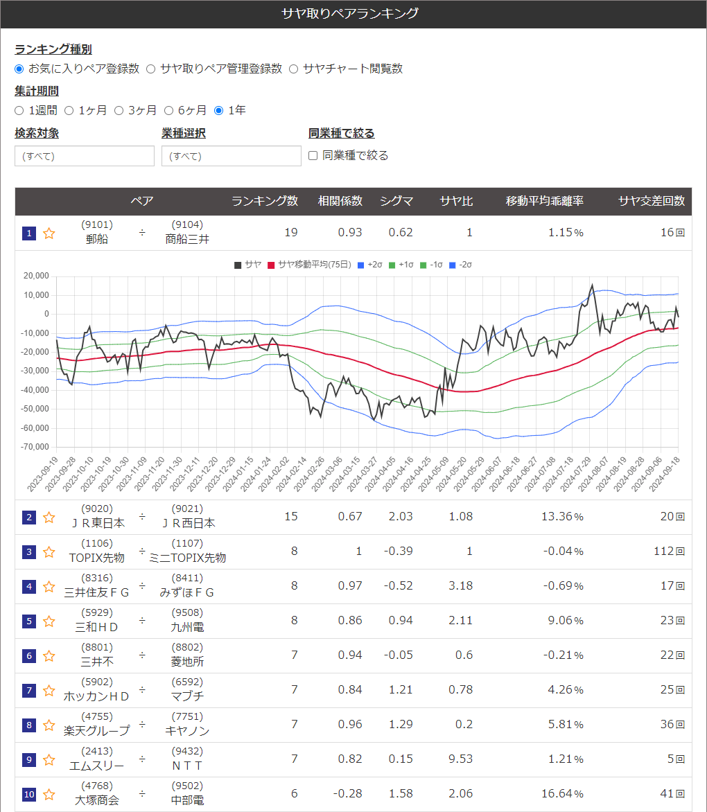 サヤトレ内で使われているデータを元にサヤ取り投資家が注目しているサヤ取りペアをランキング形式で確認する事が可能です。